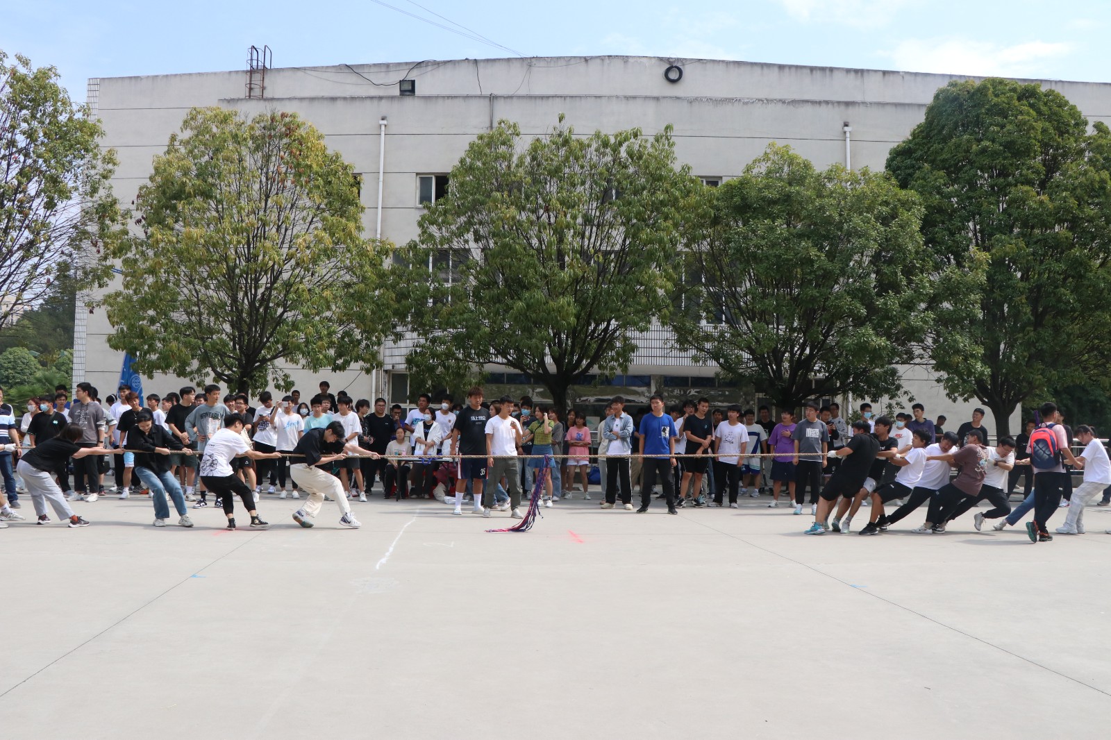 为积极响应校庆五十周年的号召,培养学生们的集体荣誉感,增强学生体质,同时为了丰富国庆期间大学生校园生活,10月1日至2日,9428cn太阳集团古天乐在网球场举办了“贺校庆、展风采、凝心聚力”为主题的拔河比赛,辅导员李键雯、甘甜及22级全体新生参与了此次活动。