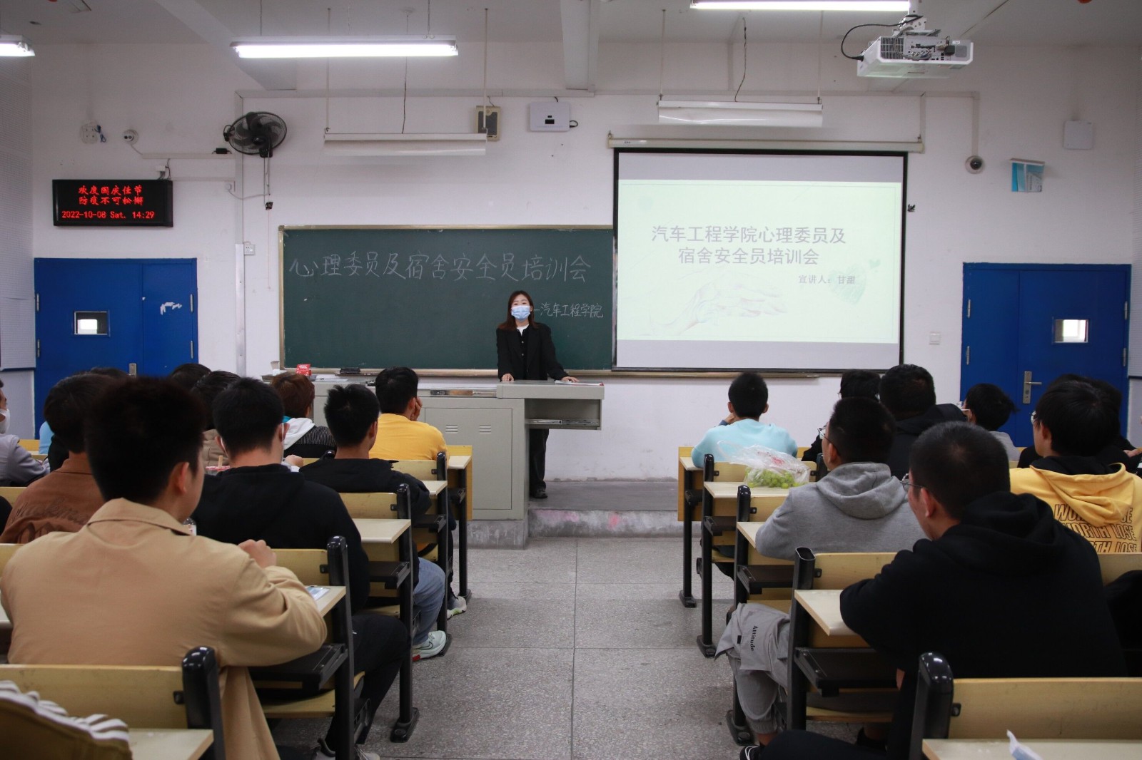 培训会上,甘甜通过列举近年来大学生出现的心理健康问题讲解了心理健康教育及宿舍安全员工作的重要性,深入剖析心理委员及宿舍安全员的角色定位、工作职责,并叮嘱心理委员与宿舍安全员要做到善于倾听,达到共情,保护隐私,积极疏导。最后,甘甜强调,心理委员与宿舍安全员发现问题后要及时向班主任、辅导员反映,引导同学积极向学校的心理健康咨询中心寻求帮助,切实做好宿舍同学的心理健康及安全工作。