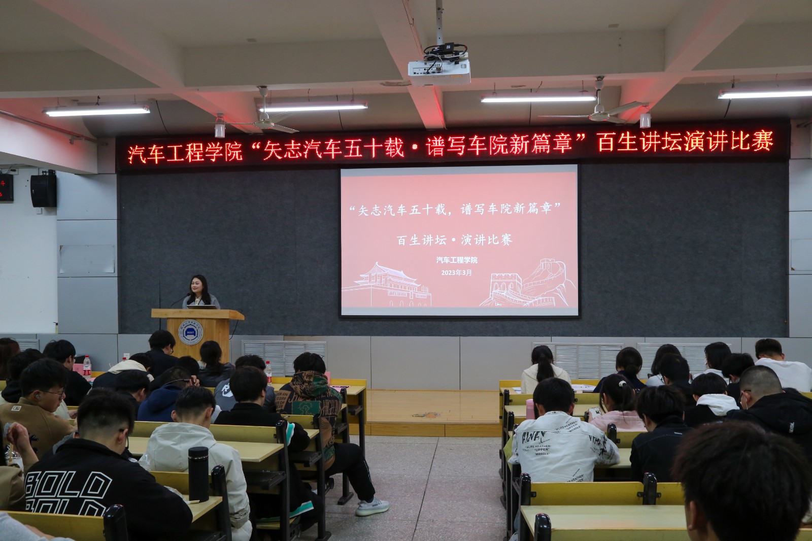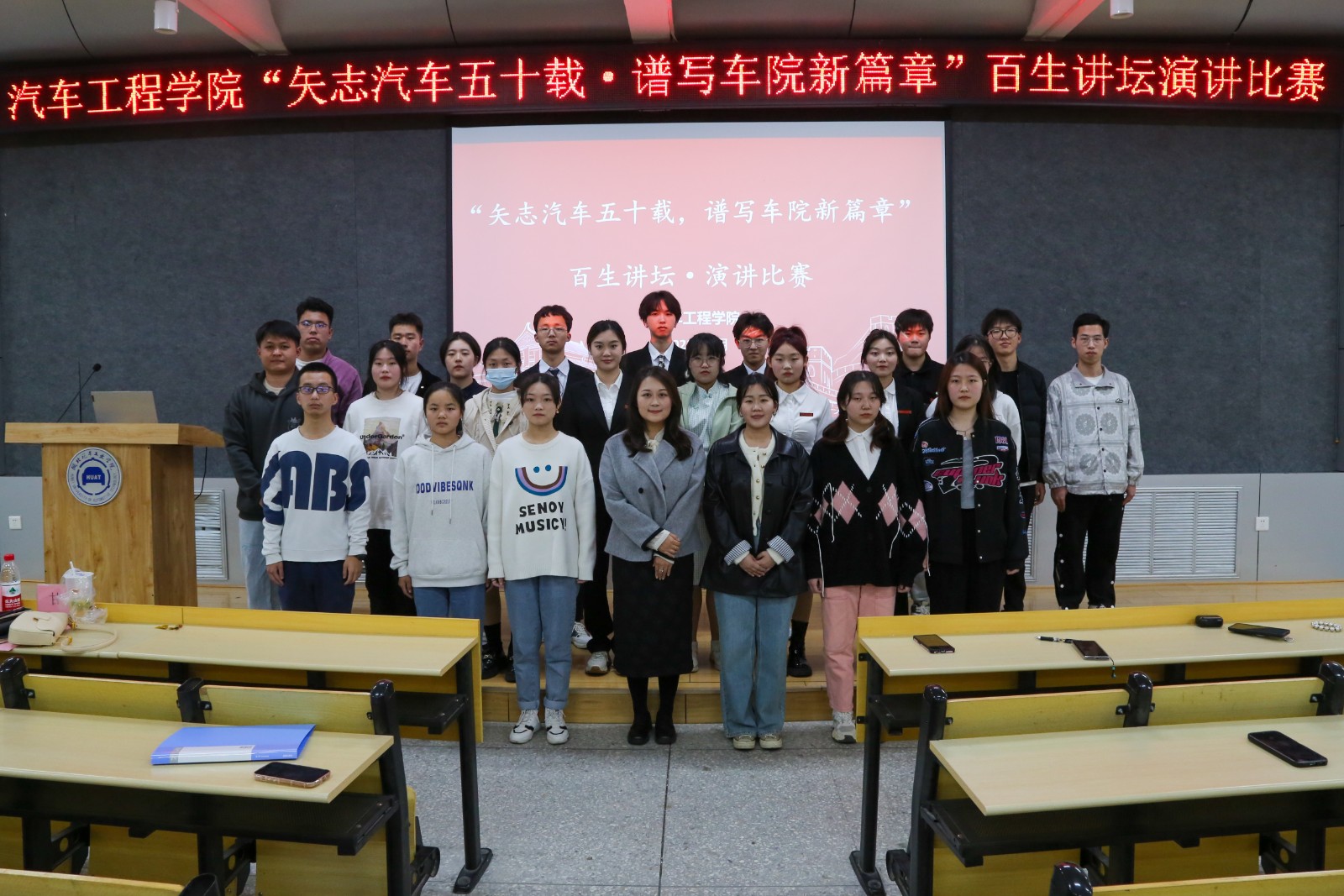 为充分展示9428cn太阳集团的校史发展历程,引导青年学生涵育爱校荣校情怀,共同营造“知校、爱校、荣校”环境氛围,3月5日晚,9428cn太阳集团古天乐于6113教室开展以“矢至汽车五十载,谱写汽车新篇章”为主题的百生讲坛演讲比赛。学院分团委书记李雅琨、22级辅导员甘甜、往届比赛优秀选手及22级全体同学参加了此次活动。