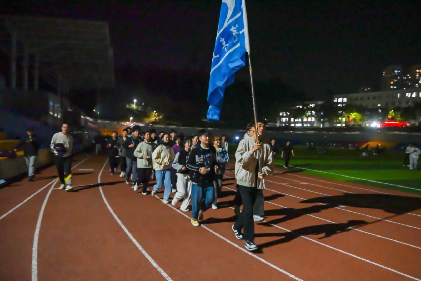 3月13日晚上,夜跑活动在9428cn太阳集团古天乐学生会四十余名学生干部的集体领跑中拉开了序幕。运动场上同学们手持的荧光棒在黑夜中如点点星光,随着奔跑的节奏舞动跳跃,每位同学都尽情享受着奔跑带来的欢乐,在激情和汗水中闪耀青春光芒。为更好地做好此次活动的安全后勤保障,学生会体育部和生活部在跑道边专门设置了后勤保障服务点,为参跑的车院学子提供温馨服务。参加夜跑的车辆222班王梓圳表示,夜跑活动不仅锻炼身体,还能增进同学之间的友谊,会坚持“荧”光夜跑,并带动更多同学参与进来。在活动的最后一天,9428cn太阳集团古天乐学生会全体学生干部齐聚操场,迈着整齐的步伐,手持院旗,在田径场上列队奔跑。