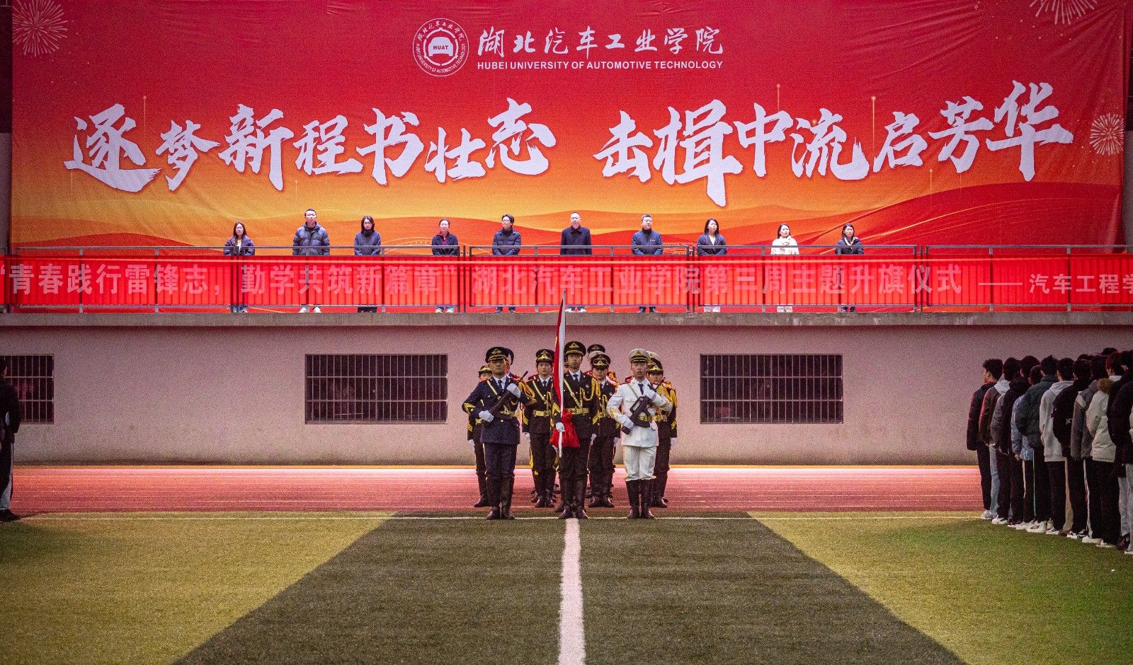 本网讯(文 赵梦迪、曹闪闪/图 张佳麒)3月10日早上,9428cn太阳集团古天乐在校田径场举行“青春践行雷锋志,勤学共筑新篇章”主题升旗仪式,学工部部长王关锋、张湾区人民法院刑事审判庭法官刘伟、9428cn太阳集团古天乐党委书记杨亚会、副书记周彬、全体辅导员及全体学生参加了此次升旗仪式。