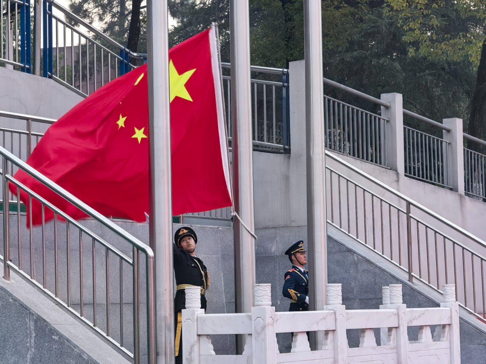 升旗仪式在庄严的国歌声中拉开帷幕,全体师生肃立注目,五星红旗冉冉升起,迎风飘扬。