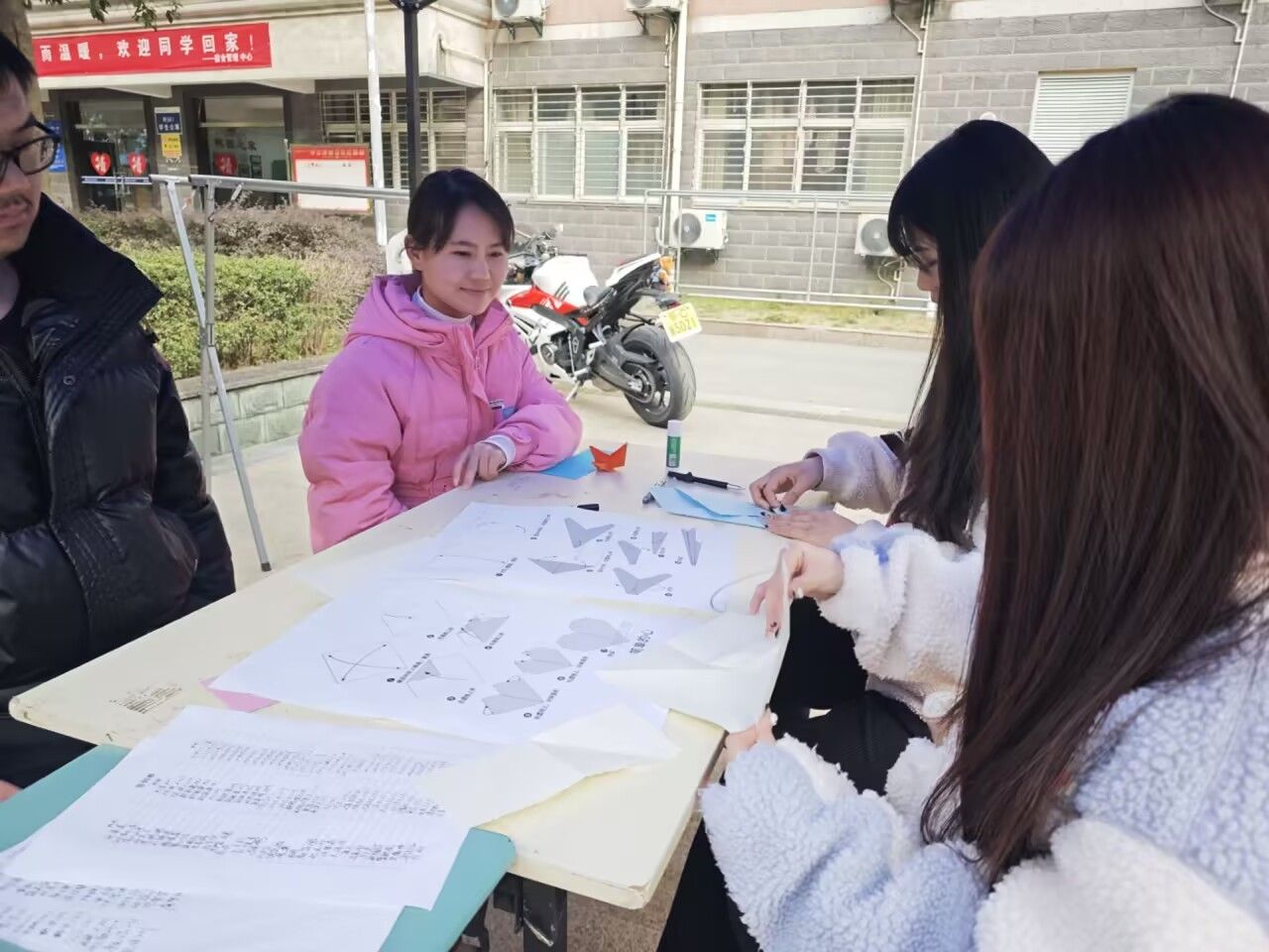 活动现场,五彩斑斓的彩纸铺展成一片“创意海洋”。指导人员组成教学小组,从基础折纸技法入手,带领参与者们制作千纸鹤、玫瑰花、立体爱心等作品。参与者们还纷纷将祝福语写在纸上,表达对女性的赞美、对友谊的珍视以及对女性权益的关注等。“折纸不仅是技艺,更是心意的传递。我们希望每位同学都能通过作品表达对女生的祝福。”活动负责人朱同学表示。这些承载着温暖话语的折纸作品被精心布置,拼成“女生节快乐”等字样,成为校园里一道亮丽的风景。