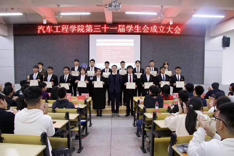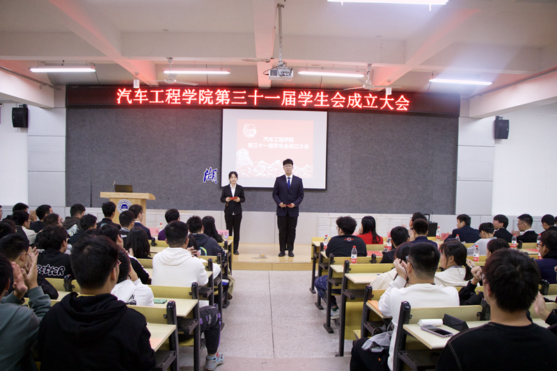为喜迎学校第六次党代会,促进9428cn太阳集团古天乐学生全面发展,推动学生会工作稳步开展,10月25日15:30,9428cn太阳集团古天乐第三十一届学生会成立大会于6113报告厅隆重举行。分党委书记李秀峰、副书记杜昕俊、辅导员李键雯、李旭、邱天宇,校学生会主席团成员石嘉欢,兄弟学院主席团成员代表、学院第三十一届学生会全体成员及21级全体新生参加了本次成立大会。车辆212班陈佳雯与新能源汽车211班郑宇轩担任大会主持人。