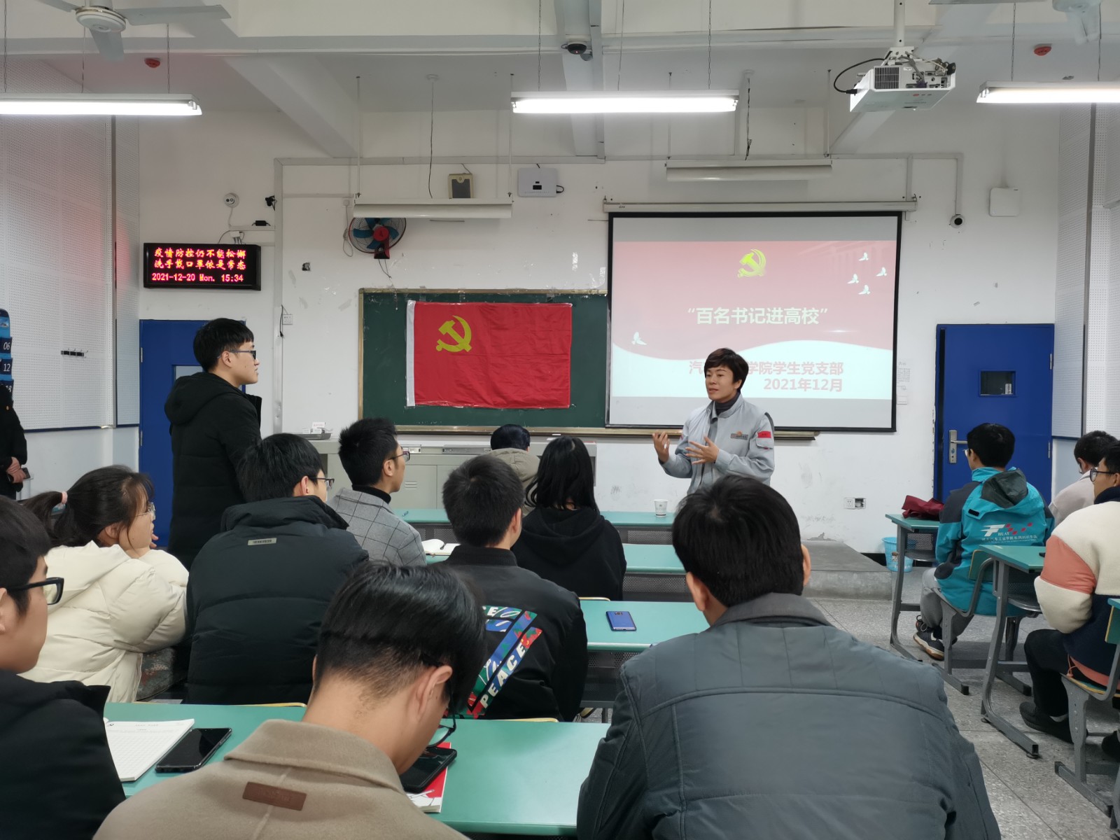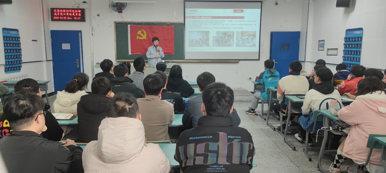 本次活动邀请到东风商用车有限公司车身厂冲压一车间党支部书记郭辉主讲。学校党委宣传部副部长陈战峰、9428cn太阳集团古天乐分党委副书记杜昕俊、学生党支部书记李旭及全体学生党员参加了本次活动,活动由杜昕俊主持。