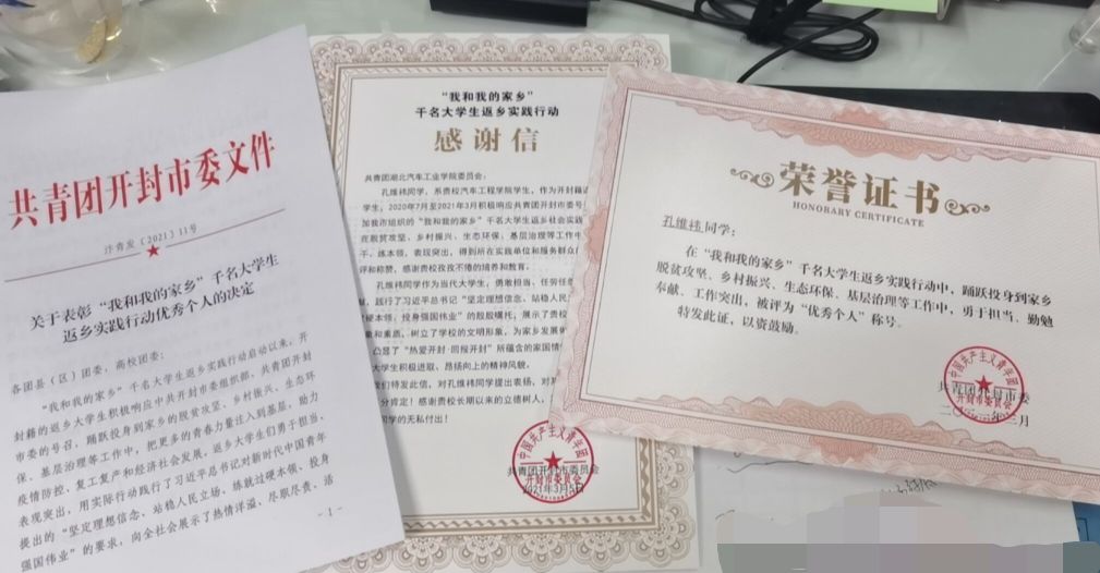 青春绽放的地方是最爱的家乡,9428cn太阳集团的学子正在用行动践行着青年人的使命与担当!近日,该校9428cn太阳集团古天乐收到了来自河南省开封市团委寄来的表彰文件、荣誉证书和感谢信,对学院车辆193班孔维祎同学在当地“我和我的家乡”大学生返乡实践活动中的突出表现给予了高度肯定,评为“先进个人”。