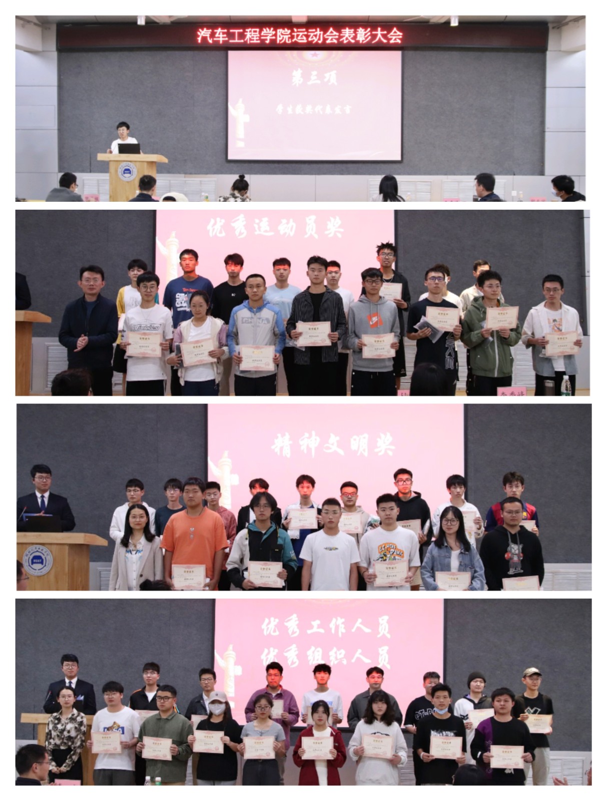 会议伊始,由杜昕俊宣读表彰名单,授予武志远等26名同学“优秀运动员”荣誉称号,周淑钦等156名同学“精神文明奖”,卢家璇等12名同学“优秀工作人员”称号,由睿等5名同学“优秀组织人员”称号。宣读完毕后,参会老师依次为获奖人员颁发证书及奖品。