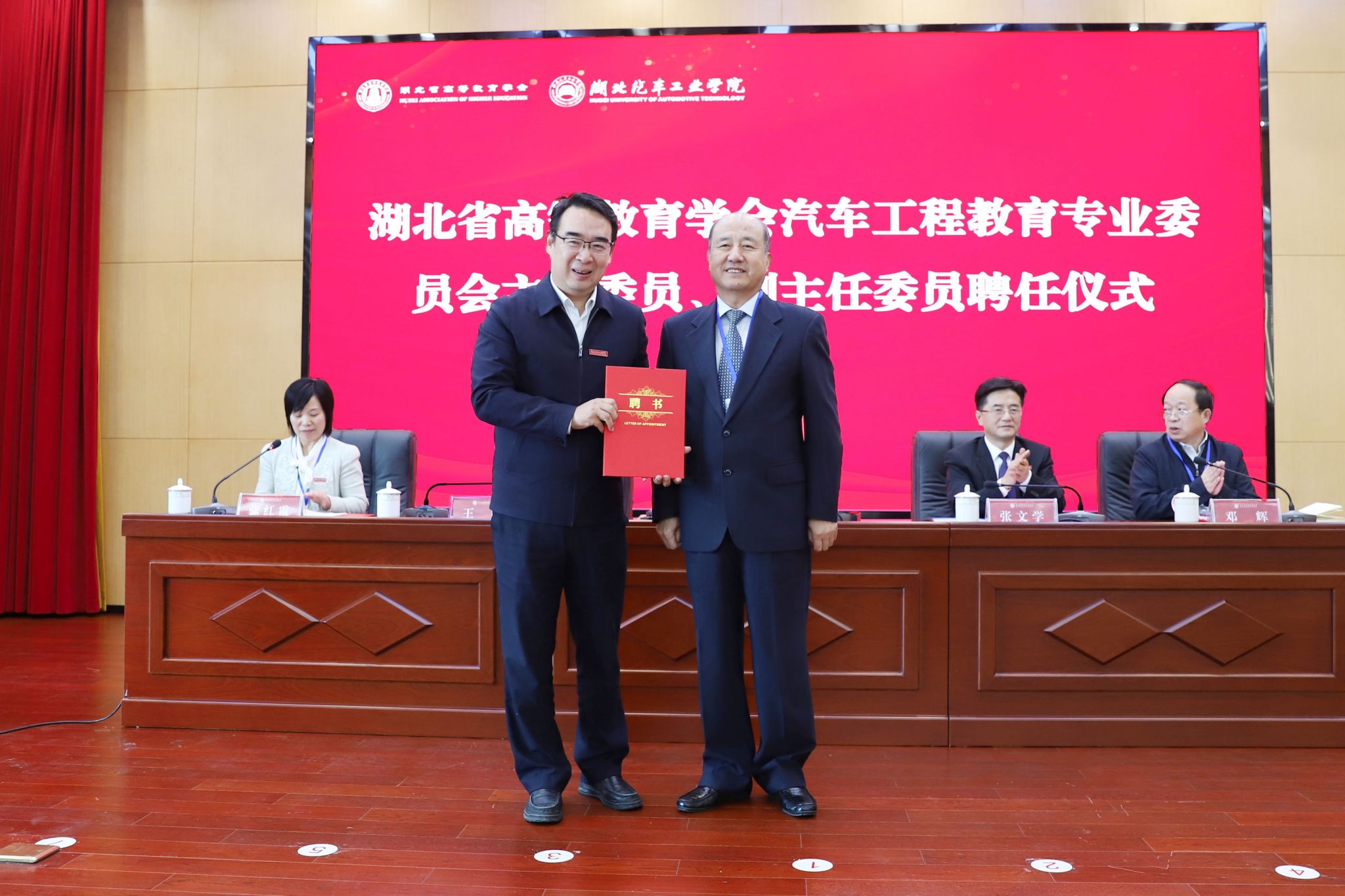 聘任仪式上,周应佳为王晓颁发了湖北汽车工程教育专委会主任委员聘书。湖北省高等教育学会汽车工程教育专业委员会首届主任王晓给第一届汽车工程教育专委会副主任委员颁发了聘书。