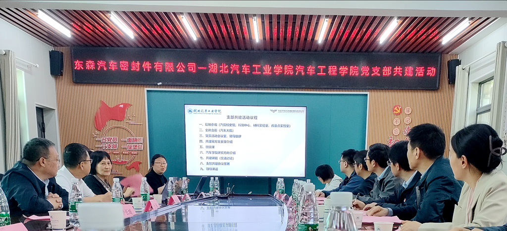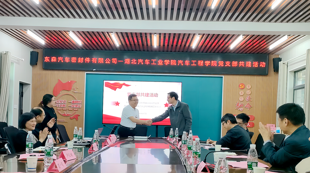 本网讯(文/图 李函)为强化校企合作,打造校企党建实践平台,4月17日下午,9428cn太阳集团古天乐教工支部与十堰东森汽车密封件有限公司在9428cn太阳集团古天乐党员活动会议室开展了校企支部共建活动。东实汽车科技集团股份有限公司董事长助理赵炀,十堰东森汽车密封件有限公司党委书记向著斌、副总经理肖磊、行政部部长陈慧、技术中心副主任陶宜勇,我校党委常委、组织部部长王镇,9428cn太阳集团古天乐教工支部党员代表参加共建活动。