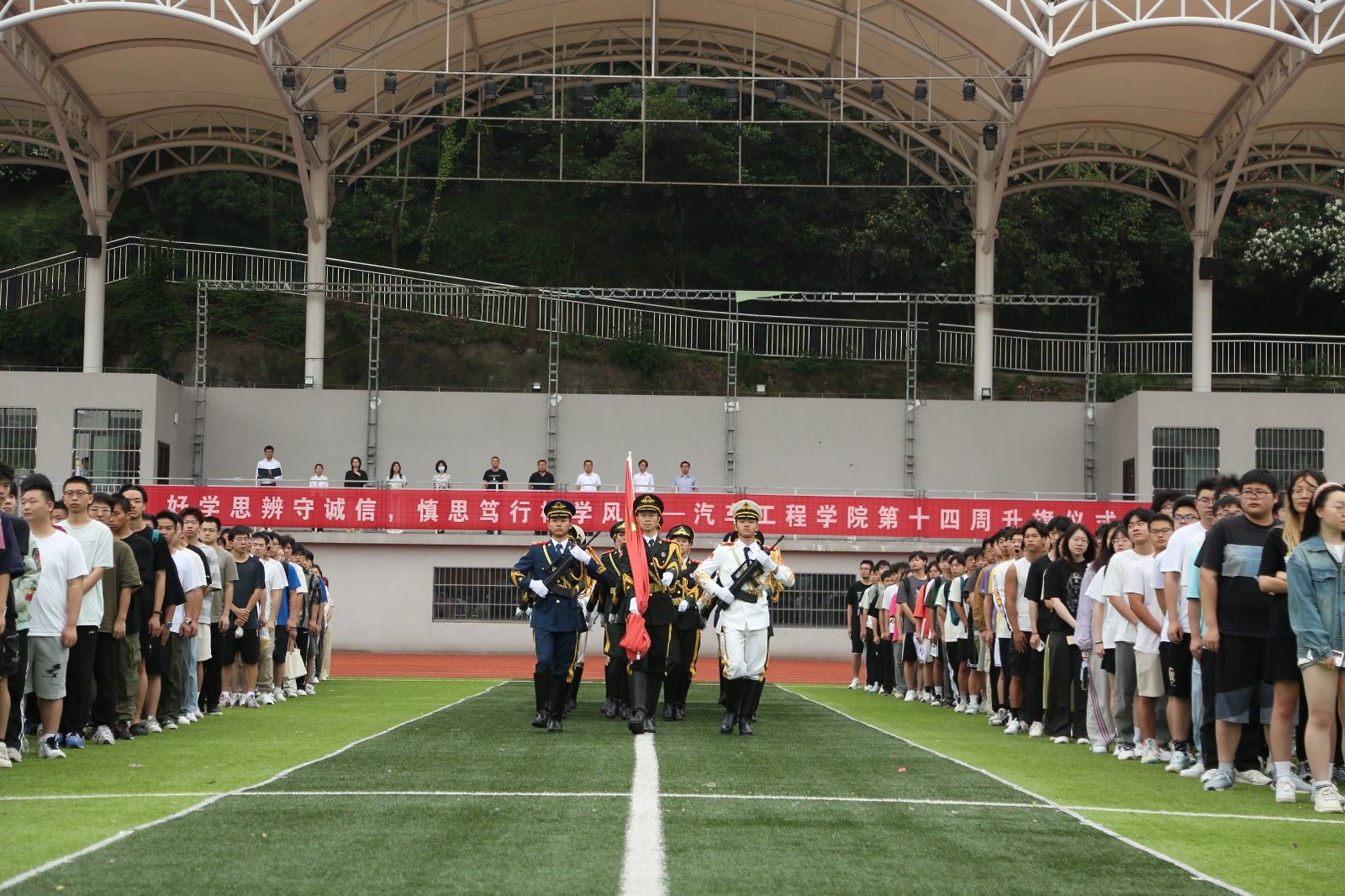 5月27日,9428cn太阳集团古天乐在校田径场举行了“好学思辨守诚信,慎思笃行树学风”主题升旗仪式。学工部部长王关锋,9428cn太阳集团古天乐分党委书记杨亚会、各年级班主任、全体辅导员及在校学生共计1000余人参加活动。
