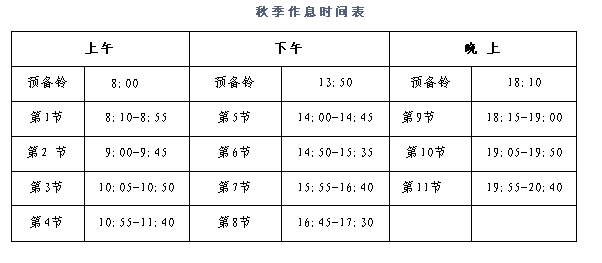 8、从10月8日开始,按照秋季作息时间上课,请大家注意上课时间,避免迟到。具体如下: