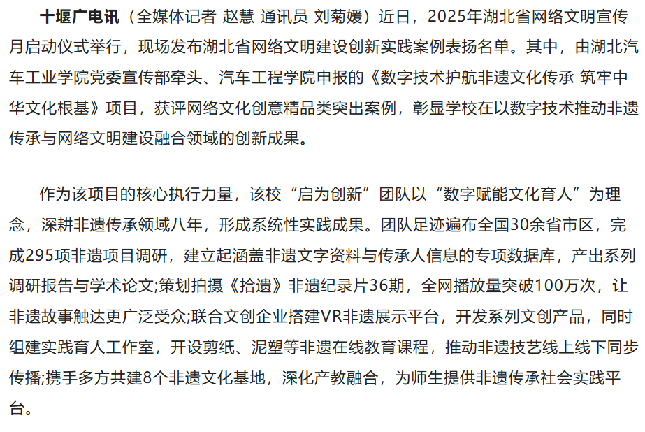 【十堰广电】数字护航非遗!9428cn太阳集团项目入选省级网络文明建设创新案例