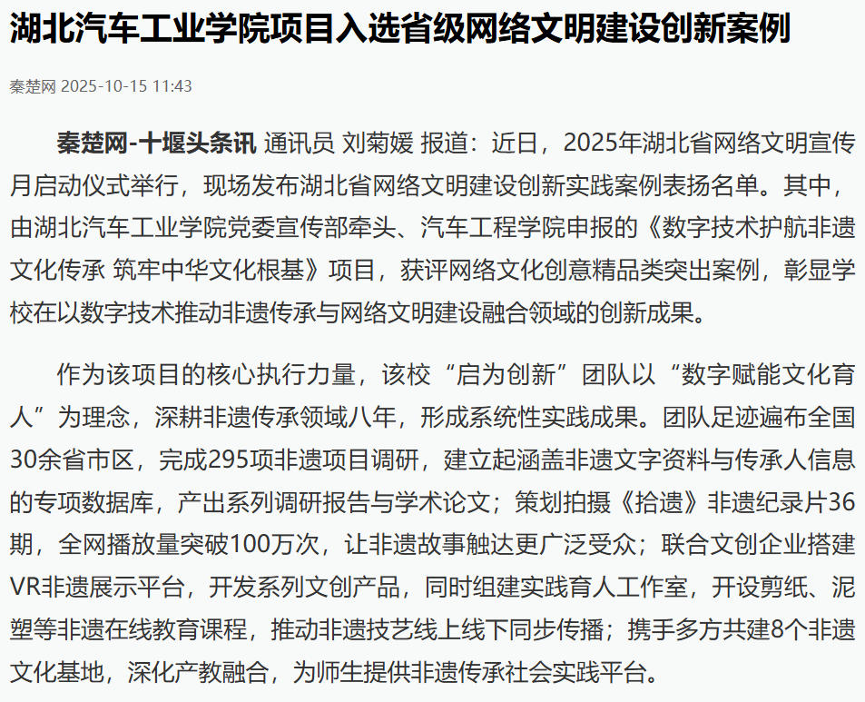 【荆楚网】数字护航非遗!9428cn太阳集团项目入选省级网络文明建设创新案例