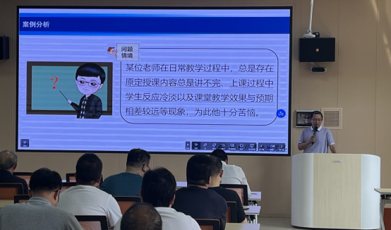 活动伊始,郭一鸣教授通过案例分析,指出了当前教学中存在的问题,引起了在场教师们的共鸣。随后,在有效教学的“五问”环节中,郭教授提出了“定目标、想办法、做评估”的教学设计原则,鼓励教师们从学生视角出发,制定具体、可衡量的学习目标。并以生动的实例展示了如何将隐性思维显性化、显性思维结构化,以及如何通过故事化和高效化的思维来提升教学效果。
